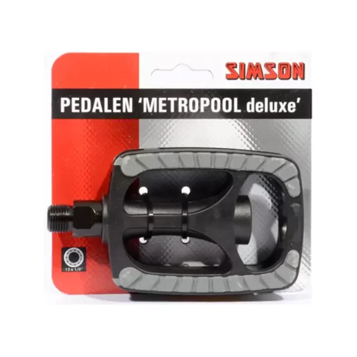 De Simson Pedalen Metropool deLuxe zijn luxe fietspedalen, vervaardigd uit duurzaam materiaal. De pedalen zijn voorzien van reflectoren en aan beide kanten een grijze "antislip" laag voor extra grip in alle omstandigheden. De pedalen zijn geschikt voor vrijwel iedere fiets, maar is met name popul...