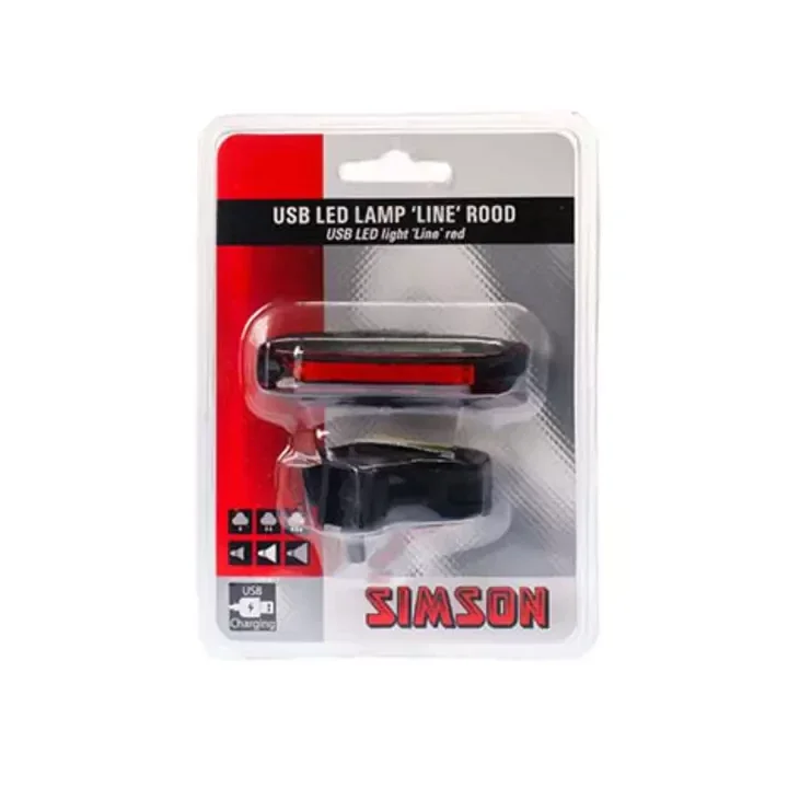 De Simson USB LED lamp ''Line'' rood is een USB oplaadbare achterlamp met een kunststof behuizing en rubberen bevestigingsband. De lamp is eenvoudig op te laden via de USB poort van de computer. De 20 LED´s geven een lichtopbrengst van 3 LUX. De lamp heeft een makkelijk te bedienen aan/uit drukkn...