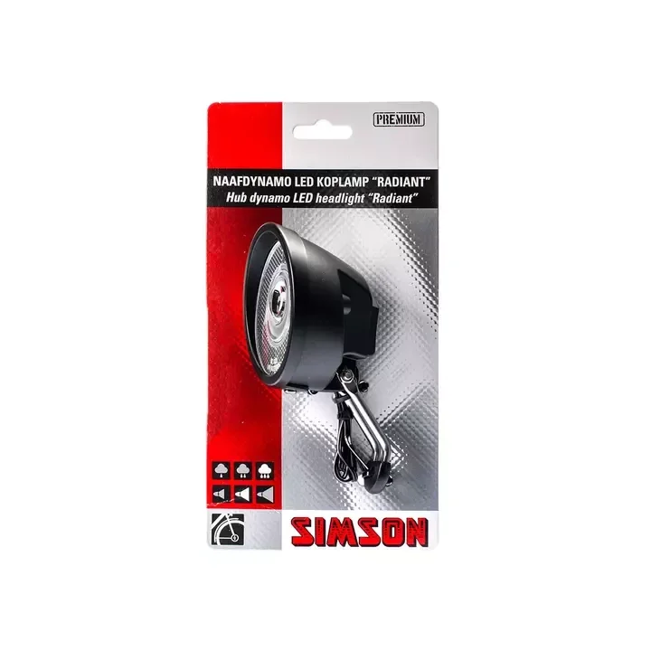 De Simson Naafdynamo koplamp ''Radiant'' is robuuste premium kwaliteit koplamp. De koplamp is onderdeel van de Simson Premium Lijn, welke bestaat uit zeer hoogewaardige kwaliteitsproducten. De witte LED heeft een lichtopbrengst van 7 Lux. Deze koplamp heeft een optische reflector en een overspann...