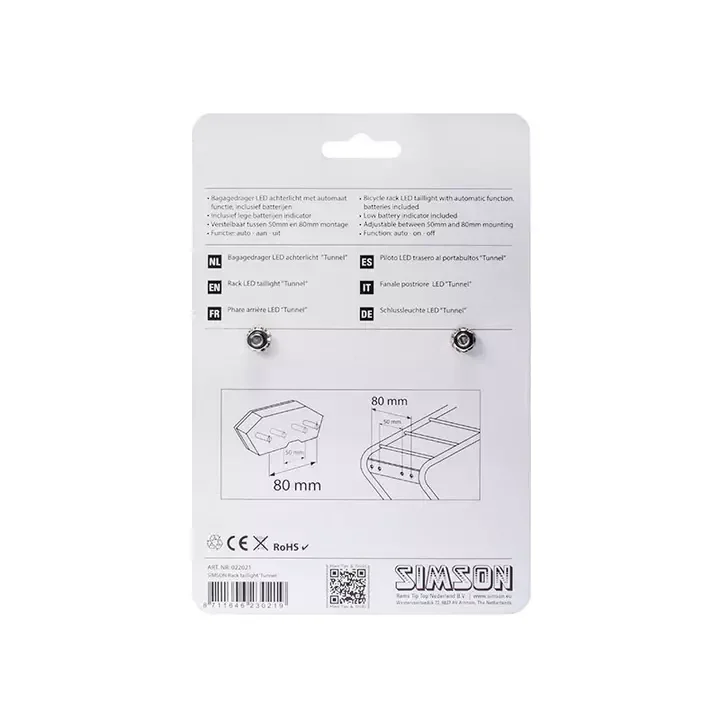 Deze Simson Batterij bagagedrager achterlicht ''Tunnel'' is een hoogwaardig premium kwaliteit achterlicht, speciaal ontworpen voor stads-, trekking- en hybridefietsen met een automatische aan/uit functie. De lamp reageert op licht en beweging en bepaald zo wanneer de lamp wel of niet aan gaat. He...