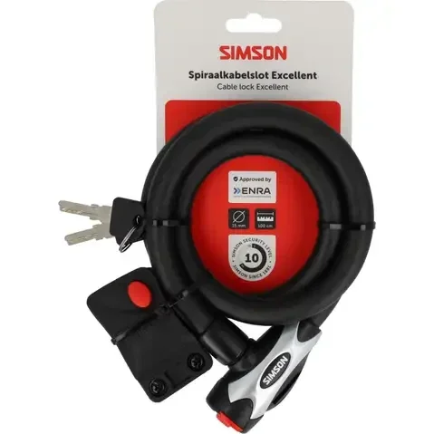 Het Simson Kabelslot Execellent size L is een robuust mat zwart kabelslot met een lengte van 1 meter. Met dit extra dikke 15mm slot staat de fiets altijd veilig. Het slot is makkelijk en compact mee te nemen en wordt geleverd inclusief bevestiging voor aan de fiets, en twee sleutels.